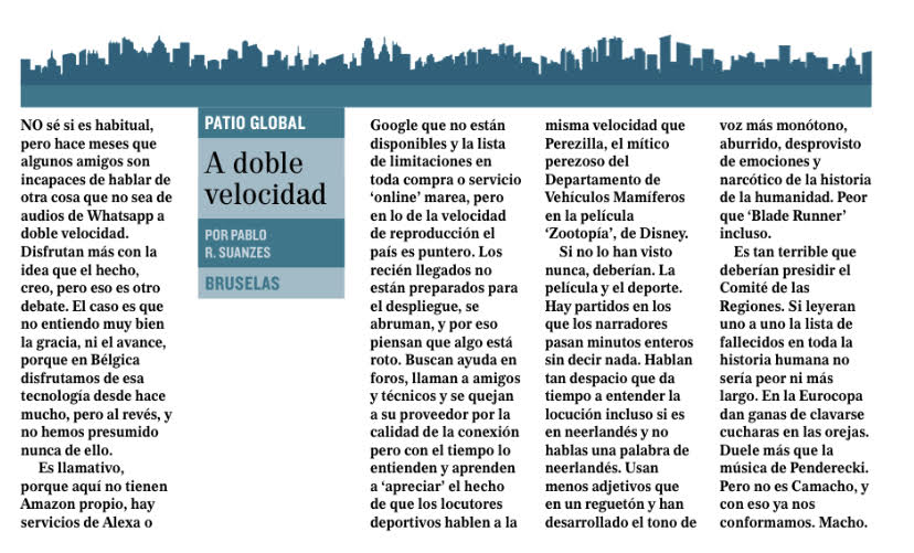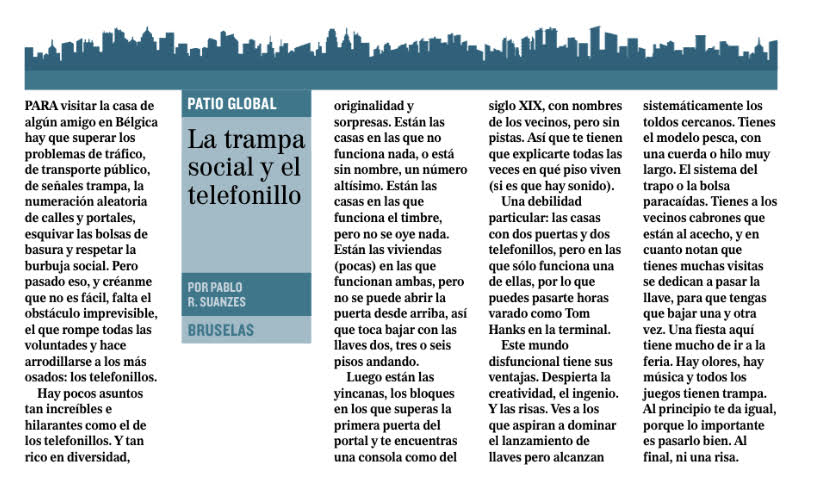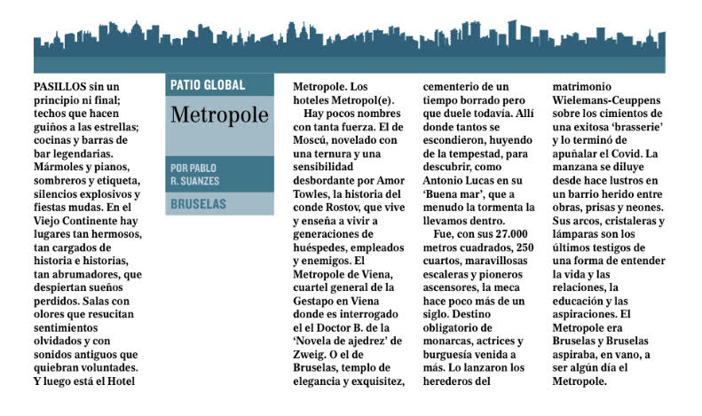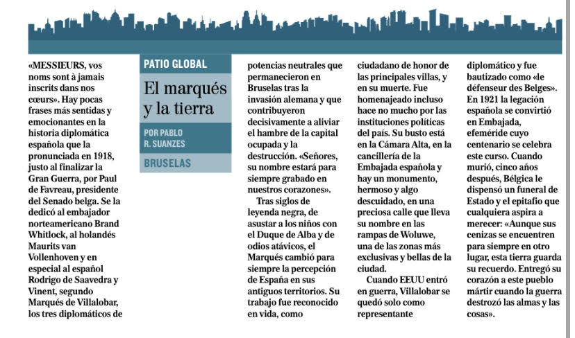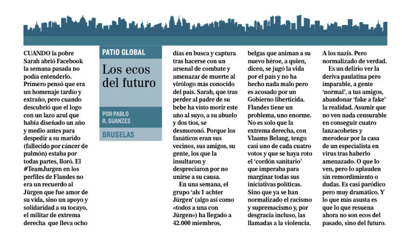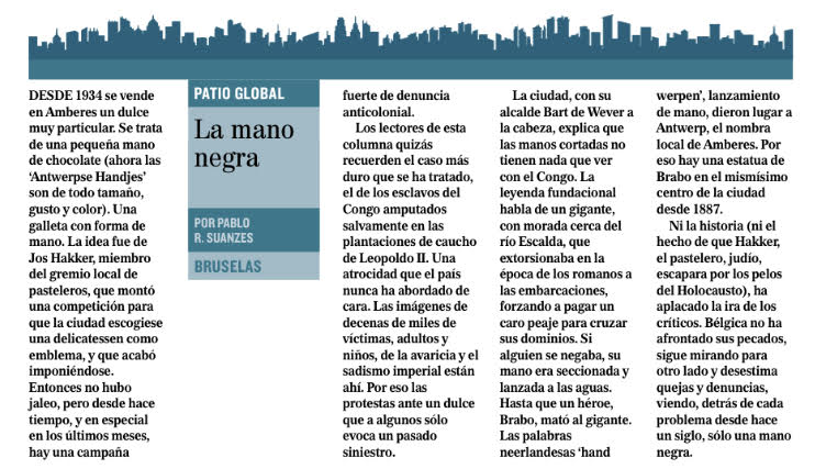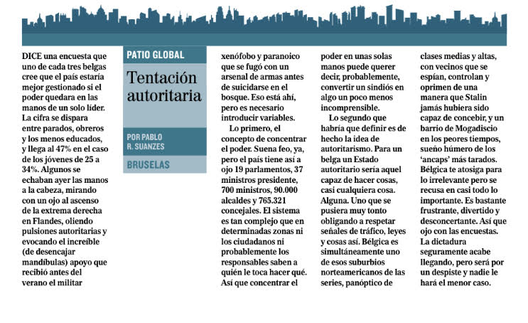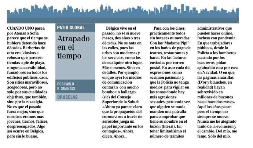 03-11-2020 Fantasmas y fantoches. “Bélgica está llena de fantasmas. No me refiero a los del pasado colonial, porque ya saben que aunque muertos y torturados los hubo por cientos de miles, esa parte de la Historia está todavía encadenada como los espíritus de los dibujos animados. Ni siquiera hablo de los infinitos fantoches, más que fantasmas, que llenan los europasillos, con tantos funcionarios de élite, diplomáticos, lobistas y periodistas estrellita pagados de sí mismos”.