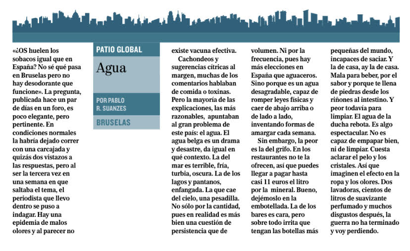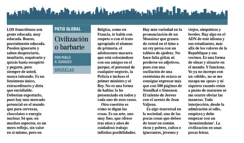 03-03-30 La Grande Colère. “Cuesta darse cuenta porque la fachada de laissez faire y pasotismo tiene el grosor de un muro románico, pero prestando atención uno se da cuenta de que Bélgica es el país de los cabreados. Estamos siempre enfadados. Por el clima, por el tráfico, por el Gobierno, por no tener Gobierno, por los impuestos, por las obras, por la burocracia, los precios. Están enfadados los obreros, los camareros, los propietarios, los profesores, los padres. Se puede cruzar el país saltando de indignación en indignación genuina. Por o a pesar de la aparente displicencia, los parches y la genial capacidad de apañarse”.