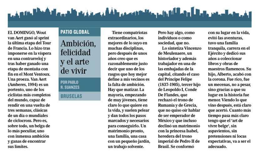 31/09/2019 Sin complejos. Si tuviera que elegir una cosa belga que exportar al resto del mundo probablemente escogería su falta de complejos. Es una ironía en una sociedad que en realidad tiene tantísimos complejos cuando mira hacia Francia u Holanda. Un país que lleva al extremo el arte de burlarse de sí mismo y sus ambiciones, pero que sufre tanto cuando sus vecinos los toman por idiotas y necesita reafirmarse con cada pequeña victoria, deportiva, cultural, económica. Dicho eso, existe una característica extendida que los hace inmunes hacia convencionalismos, costumbres y críticas. Independientes y, a su manera, libres.