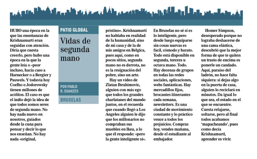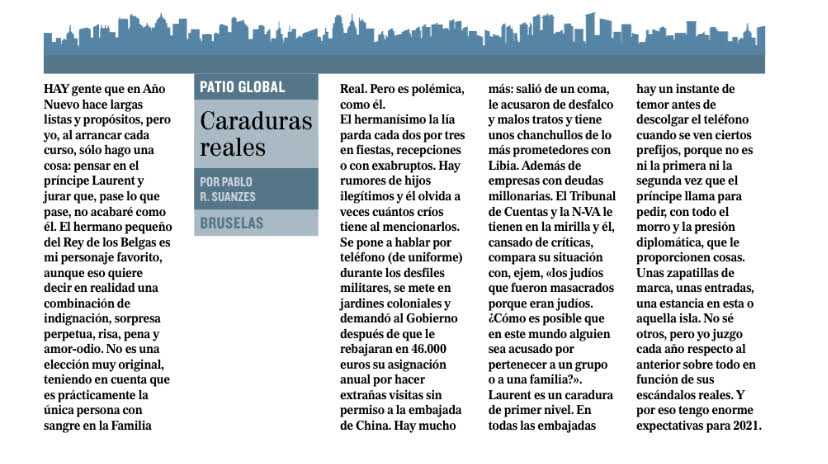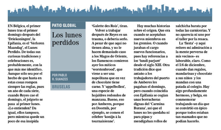 14-01-2020 Una buena conciencia. “Hay tres momentos que sintetizan y condensan el dolor de la vuelta al trabajo después de Navidades en Bélgica. La puñalada nada más poner un pie fuera del avión y ver el gris por todas partes tras diez días de sol y luz en España. La puñalada que llega con el torrente infinito y culpable de emails de unas instituciones desconectadas y unos partidos sobreexcitados. Y, sobre todo, el cementerio urbano de abetos abandonados. Calles y calles teñidas de verde pálido y marrón seco. Sin luces, adornos, vida ni esperanza”.