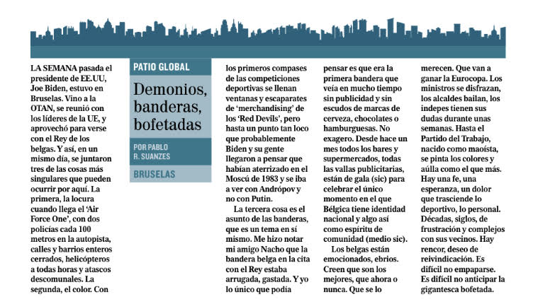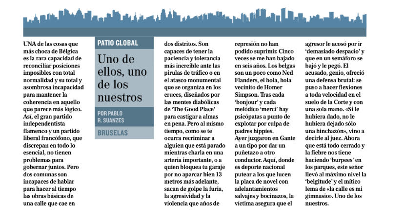 06-10-2020 Identidad. “A finales de los 90 hice un largo Interrail por Europa. Tengo una batería de recuerdos difusos y unas cuantas impresiones pseudo- sociológicas de post adolescencia muy bien grabadas: los franceses eran unos snobs; los luxemburgueses, unos estirados cuya Policía soltaba a los perros para echar a críos de estaciones vacías y frías. Países Bajos, una revelación, el primer lugar donde aprendí el concepto de laissez-faire viendo a grupos de neonazis, jipis e inmigrantes compartir las plazas en armónica indiferencia y paz. Y Bruselas, un antro feo, desagradable, digna capital de un pueblo sin alma. El paso del tiempo ha confirmado prácticamente todos los juicios y prejuicios, salvo el de los belgas”.