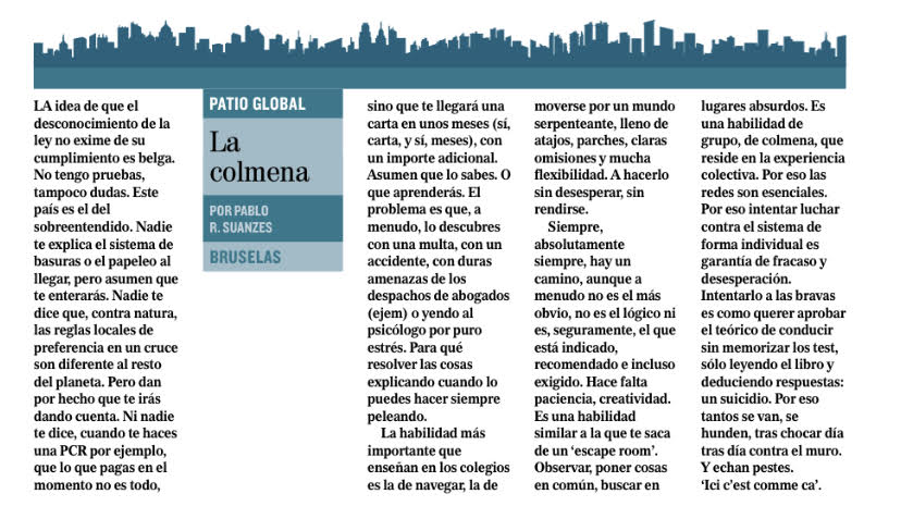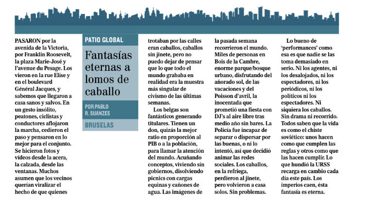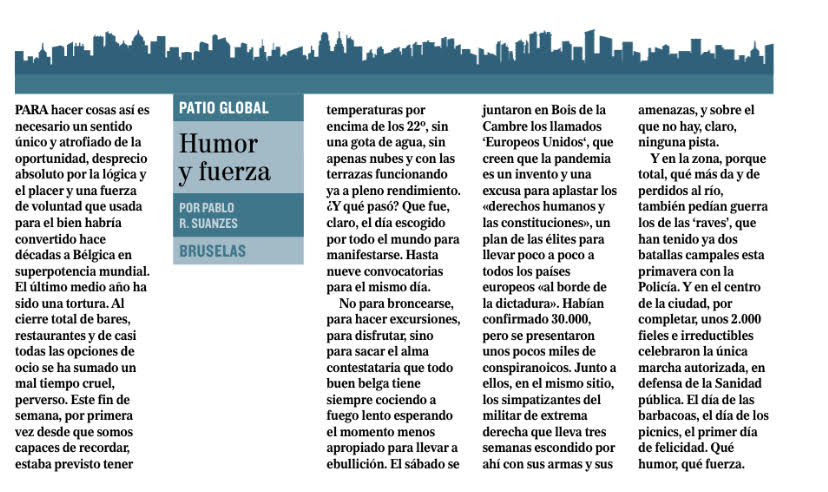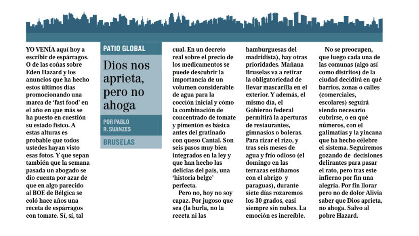 12-05-2020 Yincanas sociales. “Algo intuitivo y práctico. Ha habido mucho cachondeo, dentro y fuera del país. Esto es la esencia de la belgitude, ese talento intraducible para parchear la realidad y encajarla a martillazos donde haga falta. Prefieren y preferirán siempre una yincana loca a una rigidez centralizada, y hay que quererlos pese o seguramente por ello”.