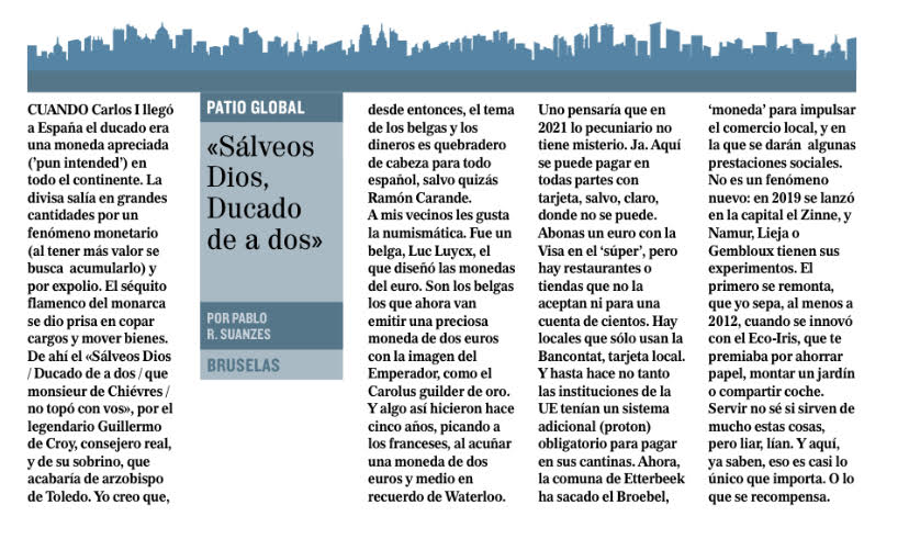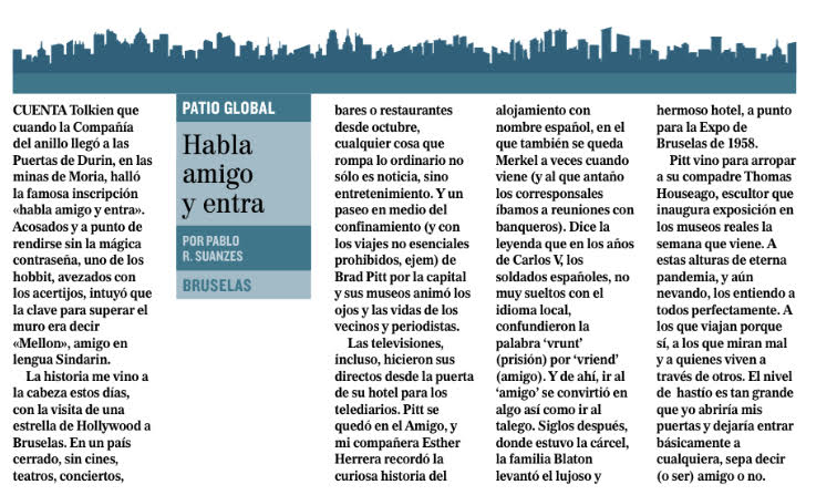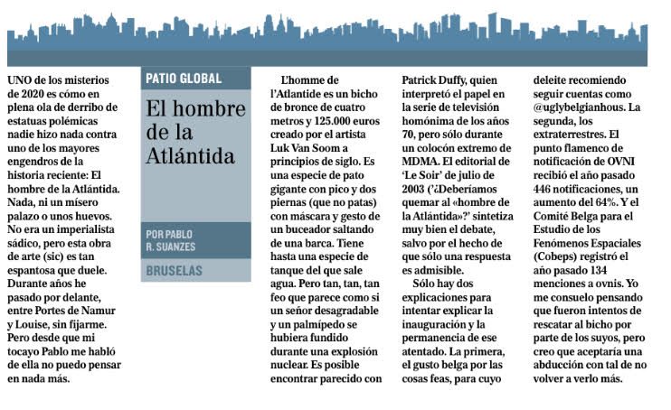 13-10-2020 Pulsiones, almas y banderas. “Las megaurbes tienen barrios con distintivos geográficos o étnicos, tipo Chinatown o Little Italy, pero en Bruselas eso nos parece poco. Tenemos, claro, como la petite Anatolie o el congoleño, Matongé. Y barrios que podrían estar en Rabat o Argel. Pero además, la ciudad ofrece a residentes y visitantes dos vías únicas para conocer la idiosincrasia, misterios y matices de la vida política, cultural o deportiva del resto del planeta. La primera es decorar el Manneken Pis. A los españoles nos gusta muchísimo esto, da juego, y por eso lo hemos visto a lo largo de los años con los colores de equipos de fútbol, regiones y hasta de Rociero. Ayer, unas decenas de personas lo pudieron disfrutar recién vestido para homenajear a los muchos profesionales sanitarios que fallecieron este año combatiendo el Covid”.