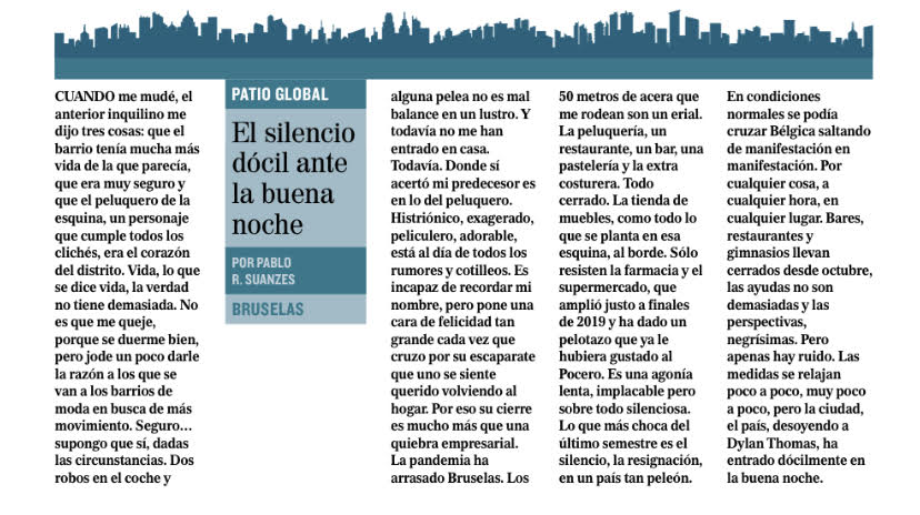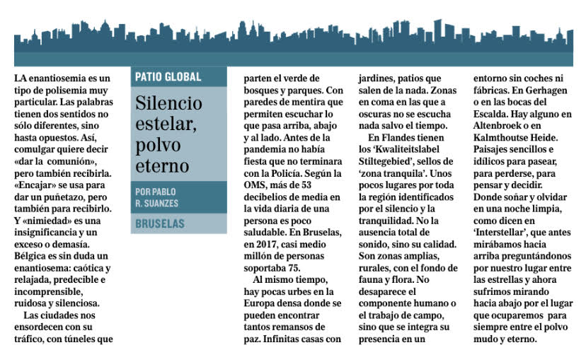 17-03-2020 La textura del tiempo. “Hay cierta sorna en el hecho de que Bruselas sea la ciudad de la velocidad cuando la UE y Bélgica están siempre al ralentí. Aquí nos movemos deprisa, muy deprisa, siempre acelerando y acelerados, haciendo mucho ruido. Los artistas tienen a veces horror vacui. Nosotros, en cambio, una especie de difuso horror silentii, miedo del y al silencio de la inmovilidad. Uno atroz, colectivo y contagioso. Silencio como sinónimo de parálisis, de fracaso. Pero sobre todo, de distancia. No son las cuatro paredes y el blancor opresivo. No es la falta de aire o de luz. No es la oxidación de músculos y del carácter. Es el silencio repentino, la bofetada que te hace consciente de la distancia con los tuyos. De la soledad”.