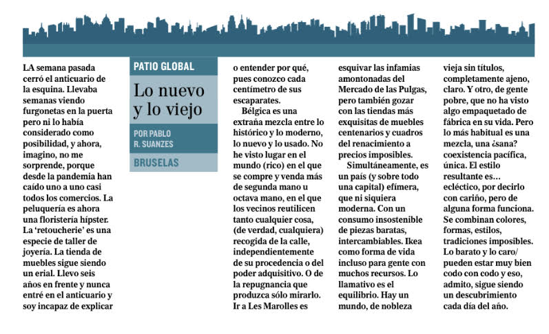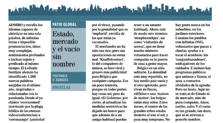 15-12-2020 El oxígeno de la edad moderna. “Vecindad, identidad, pertenencia, distancia son conceptos más relativos que absolutos. No descubro la pólvora, pero nada funciona mejor para que alguien de Madrid abra los ojos que vivir un tiempo en el centro de Europa. No es como cruzar a Biarritz o Perpiñán a ver películas no censuradas, lo sé, pero las fronteras tienen un significado muy diferente cuando cambias de nación conduciendo poco más de una hora en línea recta en cualquier dirección desde tu cocina”.