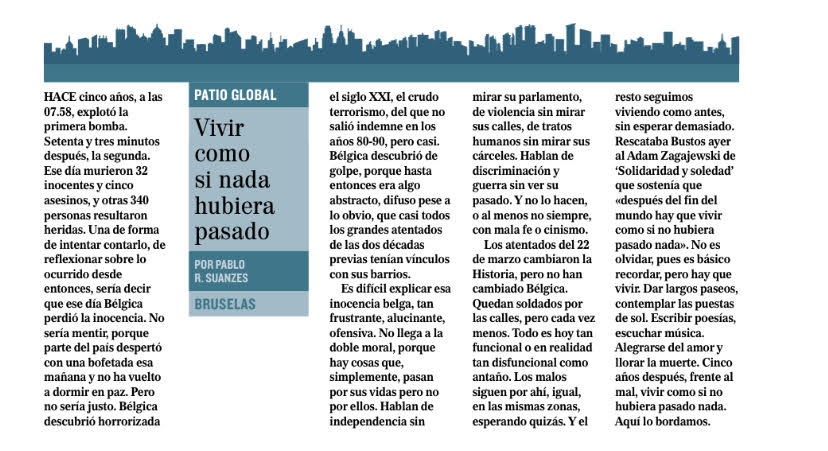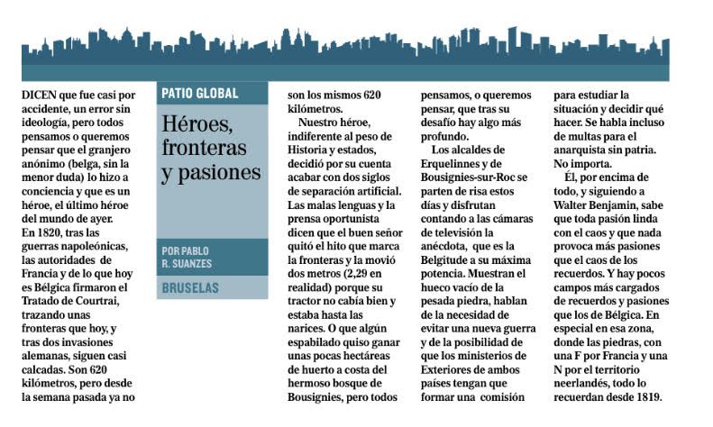 24-03-2020 El rincón de los patriotas. “El rincón más extraordinario y representativo de Bélgica no está en la Grand Place o en los museos del Sablón. No es un Palacio Real o una sede comunitaria en el Barrio europeo. No está en el pavé de Flandes, las playas de Ostende o las llanuras de las Ardenas. No está a los pies de los macizos de Dinant ni en los puentes sobre el Mosa de Namur. Ni en las murallas del castillo de Bouillon o las calles de fantasía de Brujas. El rincón más extraordinario es un pequeño hexágono, con lados de apenas cuatro o cinco metros, en el Carrefour de l’Europe, la explanada circular frente a la entrada principal de la Gare Central de la capital”.