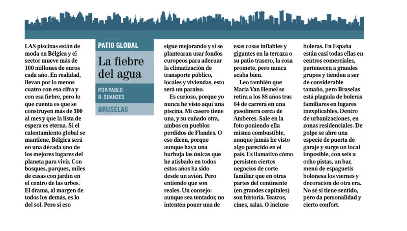 09/07/2019 Un ‘petit permis’. En la fina línea que separa el orden del caos, la civilización de la barbarie, las piscinas son el último bastión de la esperanza y la felicidad. Los que viven cerca del mar jamás han sido capaces de entender la dependencia emocional que se puede desarrollar con unos pocos metros cuadrados de agua y cloro. La familia resulta que tampoco entiende que se añore más una inmersión que a ellos. Históricamente, los que vivían en el norte del continente no entendían este idioma de depuradoras y filtros. Pero no sé si por el cambio climático o la imposición del sentido común, las cosas están cambiando.