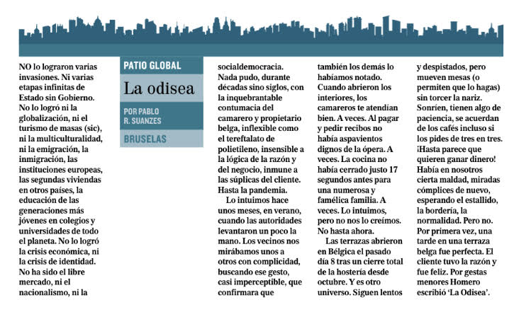22-09-2020 La sonrisa de nuestro apocalipsis. “Empezó como un comentario suelto, una anécdota que circuló entre algún conocido. Después, la historia empezó a repetirse, poco a poco primero pero cada vez con más frecuencia. Lo que era insólito empezaba a volverse norma. Recuerdo cuándo fui consciente, la caída del caballo a finales de junio, a medio camino entre la bella Dinant y Bruselas. Una braserie clásica, sin lujos ni pretensiones, en la que el camarero, sacando todo su pobre español, no sólo ofreció un licor, sino que invitó a los cafés. Les parecerá nimio, pero nunca, jamás, había ocurrido algo remotamente similar. A nadie. Durante unos minutos el grupo barajó muy seriamente la opción de llamar a un juez de los Record Guinness o comprar una placa conmemorativa”.